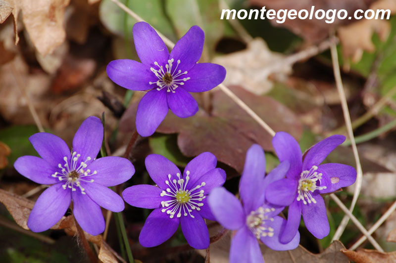 In mezzo al fogliame secco delle querce spuntano i fiori dell'Erba Trinità (Hepatica nobilis). |