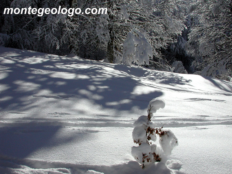 Il percorso si insinua nella valle ora ricoperta da fitti boschi coperti di neve e con leggera salita arriviamo alla radura che ospita il vecchio stazzo oramai distrutto di Capanna Blasutti 1530mt. Saliamo inizialmente dritti sulla destra orografica del vallone Filarello ma poco dopo le presunte tracce di sentiero spariscono nel bosco che diventa troppo fitto e intricato per proseguire. Torniamo in dietro e al bivio prendiamo a sinistra il sentiero Z1(destra per chi sale); questo sale leggermente nel bosco protetto dal sole con i rami degli alberi carichi di neve. Raggi di sole filtrano tra le fronde degli alberi in un paesaggio che ci verrebbe da dire “ La Taiga Abruzzese”.